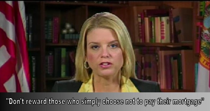 Fl. Attorney General Pam Bondi has already proven to the public that she is in the pocket of “The Banksters” and a member of the organized criminal class…She gave Chase a slap on the wrist, a fine instead of prosecution. The Criminal Banksters and Financial Terrorists need to be prosecuted. Homeowners are not settling for fines only…punish the perpetrators of their crimes not the victims. She has not passed any bills to help the homeowners of Florida only the Banks. While there is a record number of American citizens currently living paycheck to paycheck, in debt, unemployed, underemployed, without healthcare, on food stamps and in poverty, as our society is breaking down, global bankers have taken our tax dollars and given themselves all-time record-breaking bonuses. The same people who destroyed our economy have been rewarded with trillions of dollars in national wealth. It is now evident that both political parties and all three branches of government, along with the mainstream corporate media, have been bought off by a global economic elite. The Economic Elite have seized our economy, tax system and government. These people are the most depraved terrorists on the planet and they have viciously